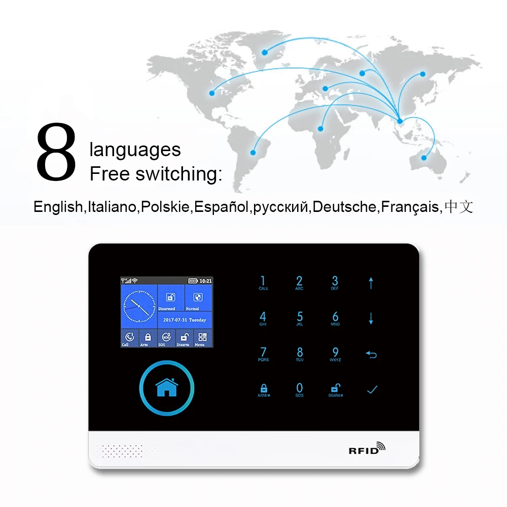 GT APP Remote Control Alarm panel Switchable 8 languages Wireless Home Security WIFI GSM GPRS Alarm system RFID card Arm Disarm : Check Here
